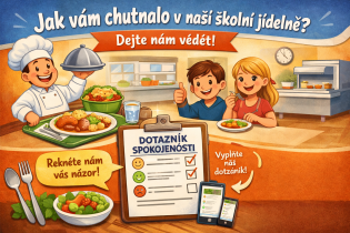 rádi bychom vás požádali o krátkou zpětnou vazbu k naší školní jídelně. Připravili jsme jednoduchý dotazník, ve kterém se můžete podělit o svůj názor na to, jak vám během posledního měsíce chutnala jídla ve školní jídelně .