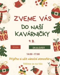 žáci 9. ročníků ZŠ Nádražní si Vás dovolují srdečně pozvat do svých vánočních kavárniček, které budou součástí programu Vánočních trhů ve středu 26. listopadu 2025.