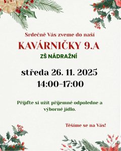 žáci 9. ročníků ZŠ Nádražní si Vás dovolují srdečně pozvat do svých vánočních kavárniček, které budou součástí programu Vánočních trhů ve středu 26. listopadu 2025.